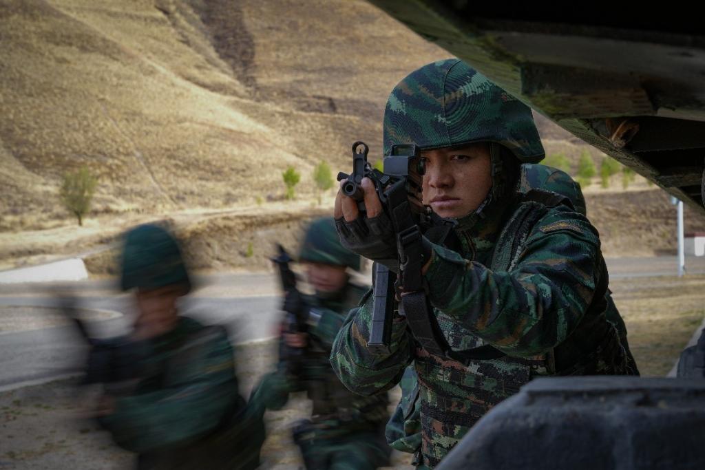 ↑达娃卓嘎(右一)和战友进行战术训练
