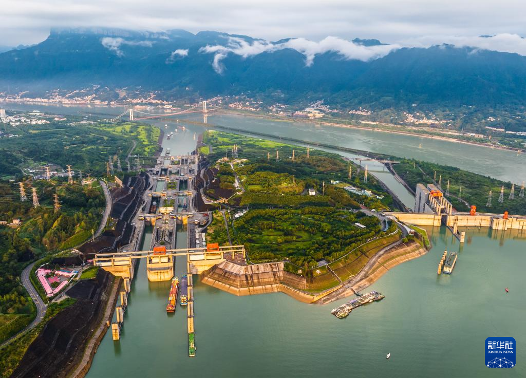 7月1日,在湖北宜昌,船舶有序通过三峡双线五级船闸和升船机(无人机照片)。新华社发(郑家裕 摄)