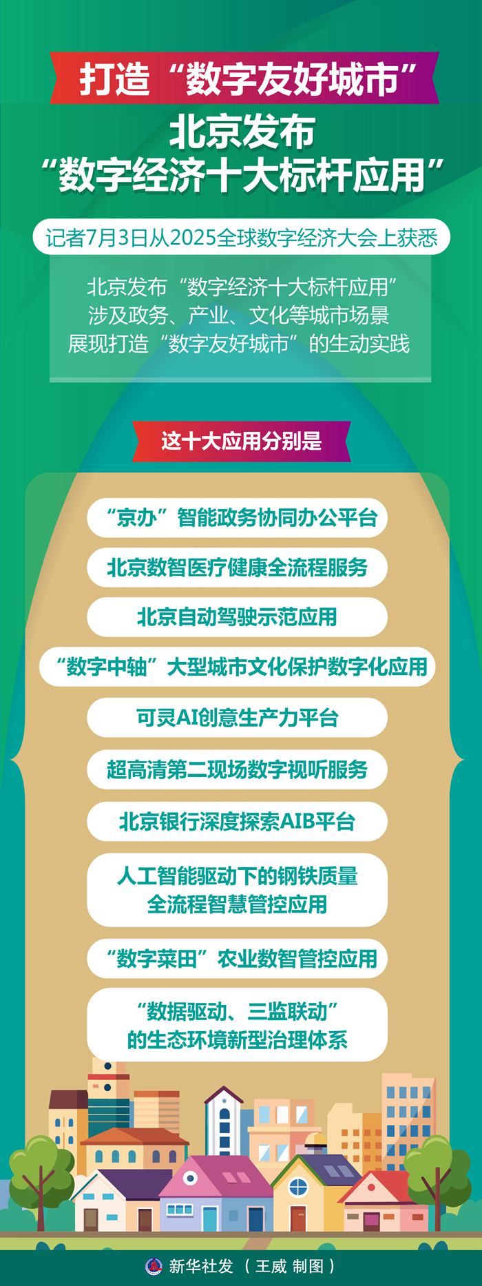 新华社北京7月3日电(记者张骁)记者3日从2025全球数字经济大会上获悉,北京发布“数字经济十大标杆应用”,涉及政务、产业、文化等城市场景,展现打造“数字友好城市”的生动实践。