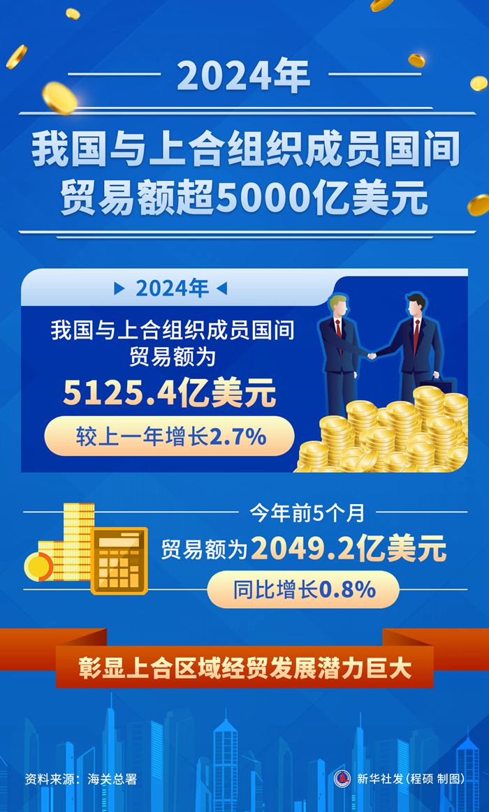 新华社青岛7月3日电(记者王凯、邹多为)海关总署2日发布数据显示,2024年,我国与上合组织成员国间贸易额为5125.4亿美元,较上一年增长2.7%;今年前5个月,贸易额为2049.2亿美元,同比增长0.8%,彰显上合区域经贸发展潜力巨大。