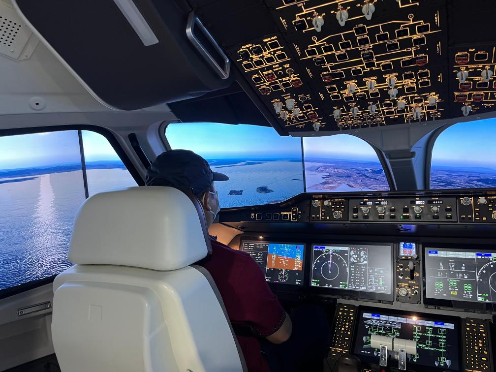 图为7月3日在北京坊数字综合体,观众在1:1的C919模拟驾驶舱内体验飞行驾驶。新华社记者 阳娜 摄