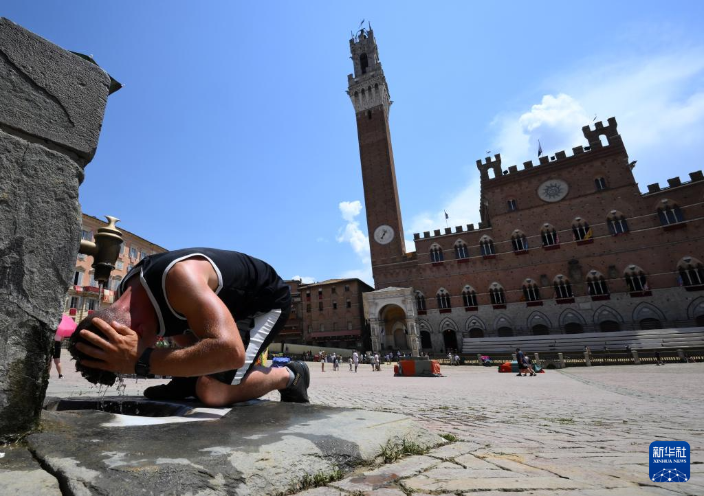 7月2日,在意大利锡耶纳,游客在田野广场冲凉。新华社发(阿尔贝托·林格利亚摄)