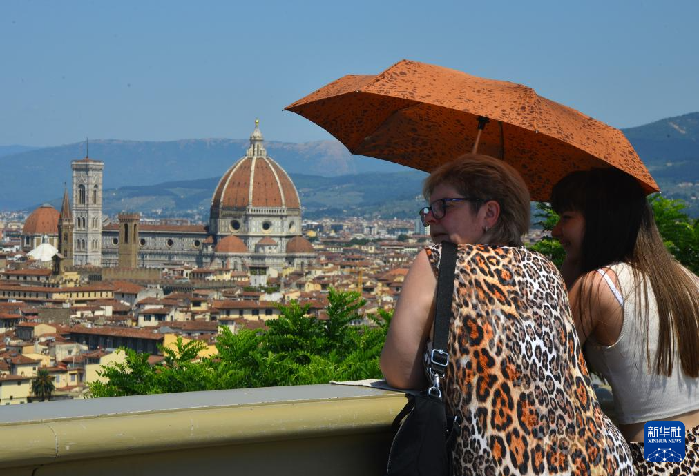 7月2日,在意大利佛罗伦萨,游客撑伞遮阳。新华社发
