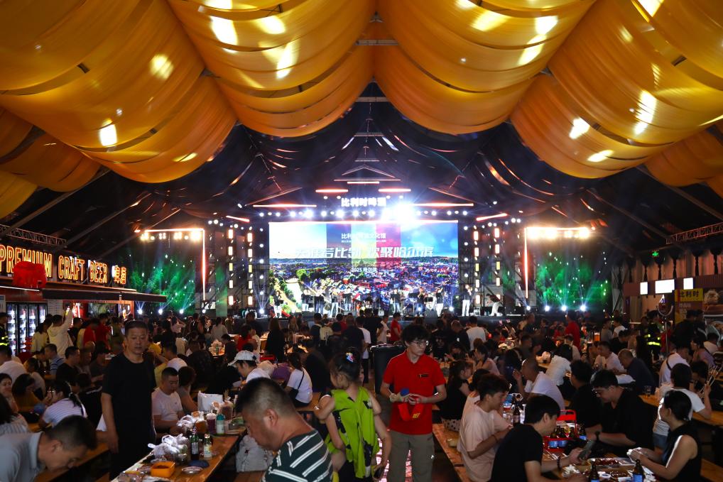 漫步园区,各个啤酒大篷里人声鼎沸,几近满座。舞台中央,舞蹈、电音轮番登场,中外游客举杯畅饮,跟着旋律一起歌唱。餐桌上,来自海外的白啤、果啤,以及本地的鲜酿等泛着诱人的泡沫,搭配烤串、红肠、爽口凉菜,香气扑鼻。