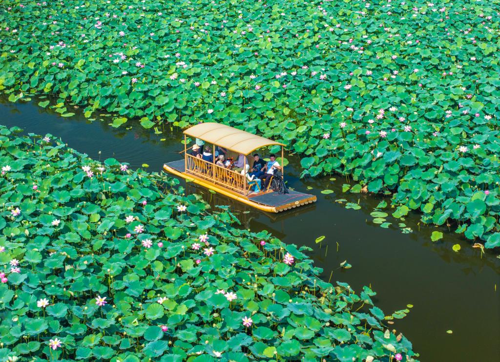 7月6日,游客在江苏省兴化市万亩荷塘景区赏荷游玩(无人机照片)。新华社发(周社根 摄)