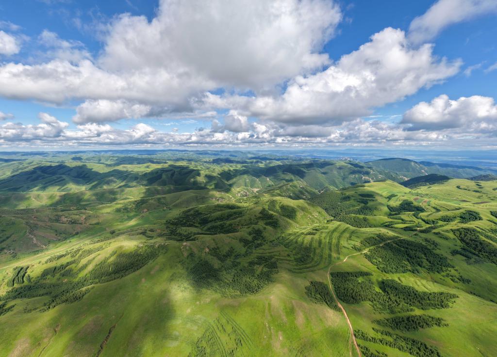 这是7月5日拍摄的敕勒川高山草原风光(无人机拼接照片)。盛夏时节,位于内蒙古呼和浩特市新城区黄花窝铺村的敕勒川高山草原绿意盎然,风景如画。新华社记者 马金瑞 摄