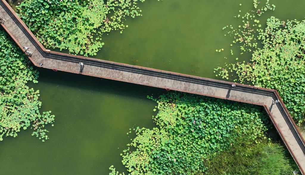 7月5日,游人在河北省石家庄市滹沱河畔赏荷游玩(无人机照片)。新华社发(梁子栋摄)