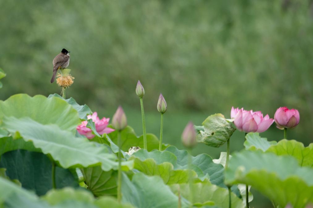 7月5日,在云南省大理白族自治州洱源县草海湿地,一只小鸟在荷塘驻足。时下,各地荷塘景色怡人,荷花亭亭玉立,为炎炎夏日增添一抹清凉诗意。新华社发(罗新才摄)