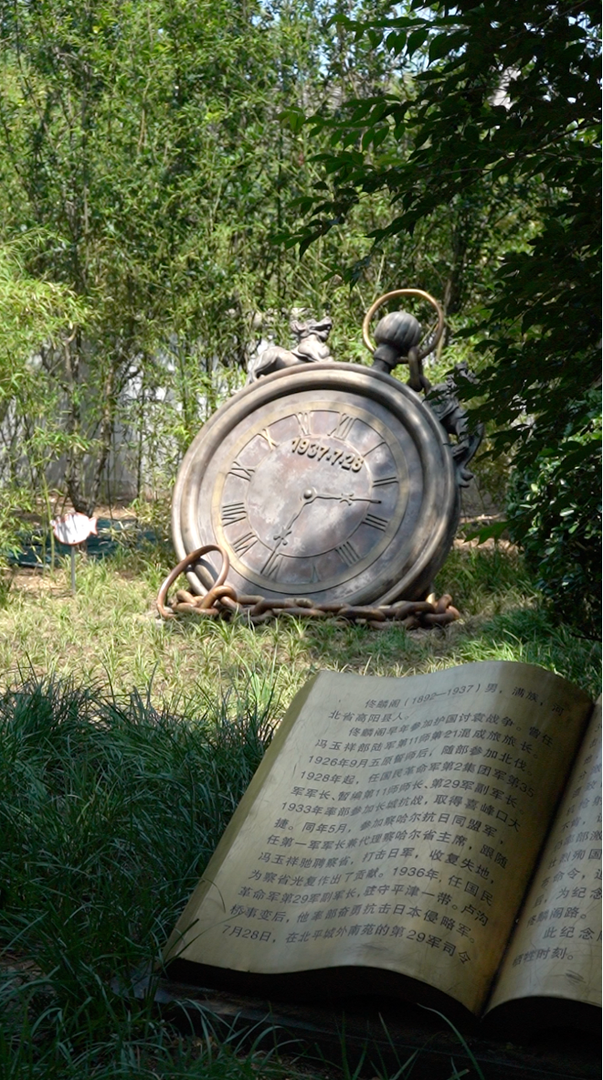 一块以铜铸成的怀表,永久伫立在北京临近长安街的草地上,上面的时刻停留在1937年7月28日14:30,这是抗日英雄佟麟阁将军牺牲的时间。