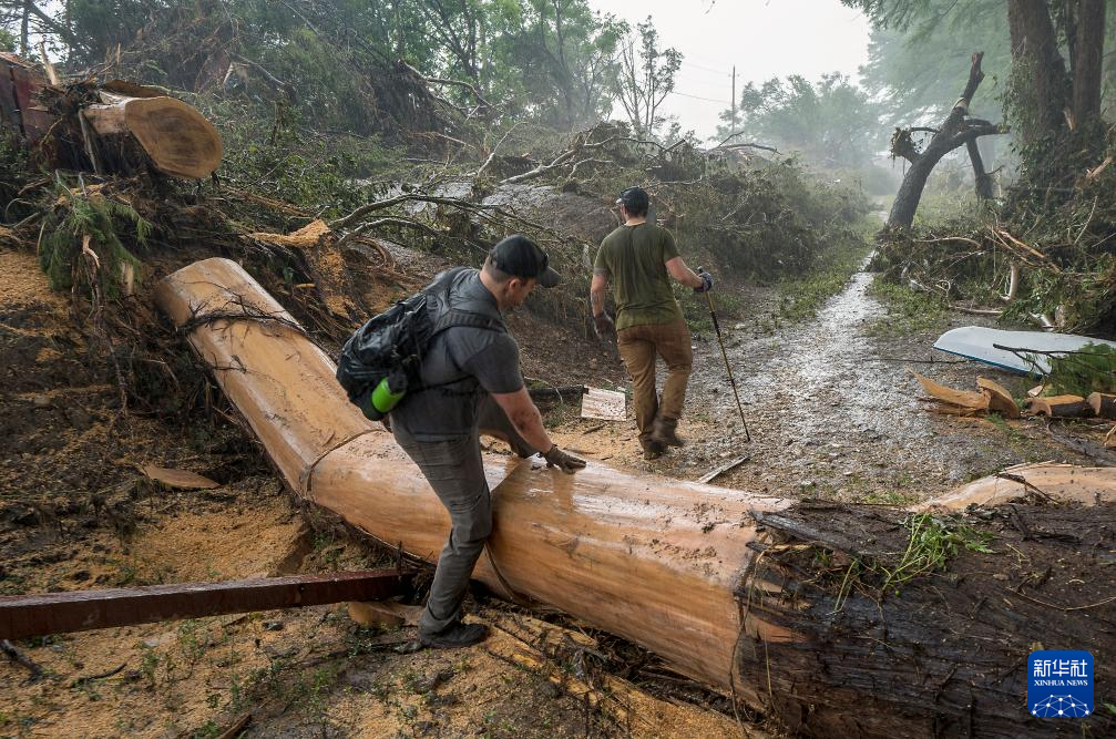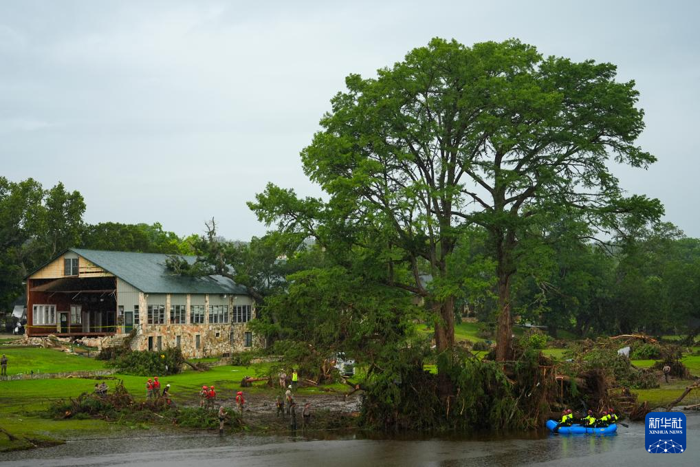 7月6日,在美国得克萨斯州亨特,救援人员在受灾地区工作。新华社/美联