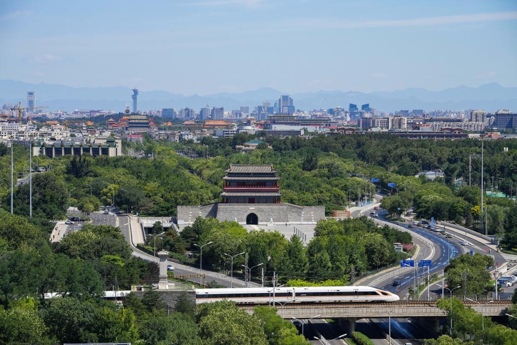 2024年7月18日,一列复兴号高铁列车从北京永定门城楼前驶过。新华社记者 鞠焕宗 摄
