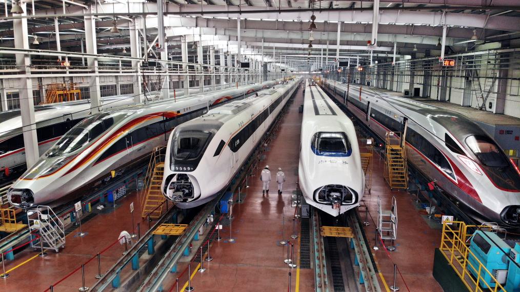 2023年1月4日,动车组在中车青岛四方机车车辆股份有限公司车库内等候发运(无人机照片)。新华社记者 李紫恒 摄