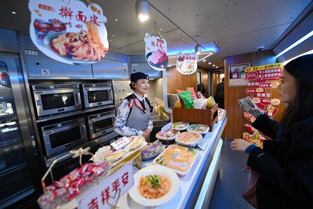 2025年1月5日,在G828次西安至香港直达高铁列车上,乘务人员为旅客介绍餐车服务情况。新华社记者 李一博 摄