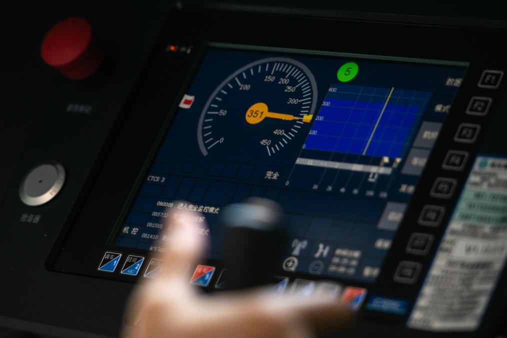 2024年6月15日拍摄的G875次列车运行控制系统屏幕,数字显示列车已达时速351公里。当日,京广高铁全线实现复兴号动车组列车按时速350公里高标运营。新华社记者 伍志尊 摄