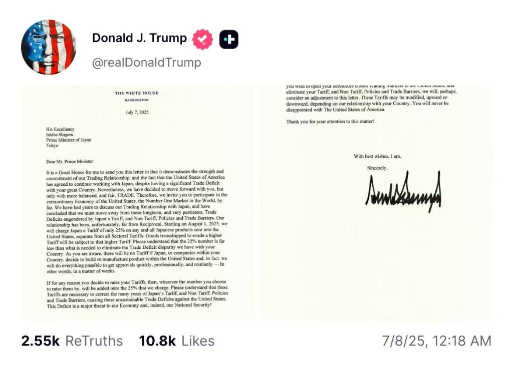 特朗普7日早些时候在自己创立的“真实社交”网站上发布他写给日本首相石破茂和韩国总统李在明的信,表示新关税将不包括其他行业关税。