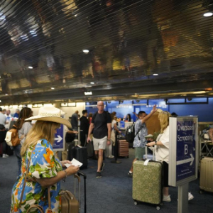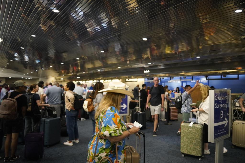 2024年7月19日,乘客在美国密尔沃基国际机场排队办理手续。新华社记者吴晓凌摄