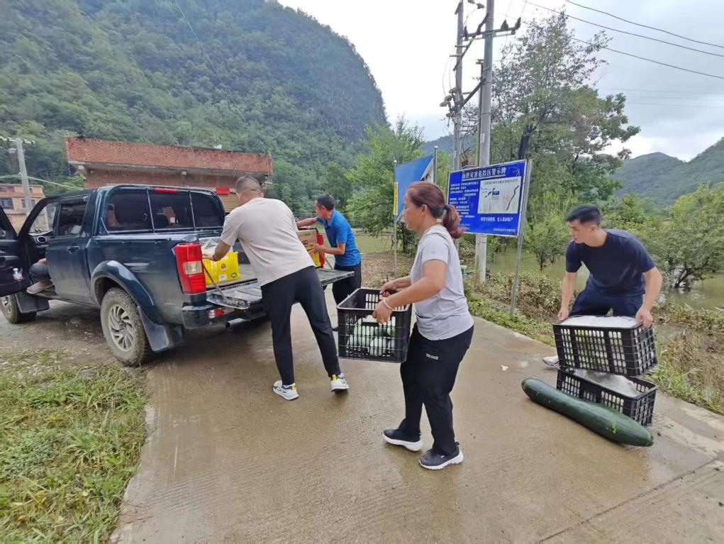 在广西南丹县月里镇巴峨村,八桂应急先锋社区响应队队长韦明霞(右二)和同事在装运生活物资送往临时安置点。(受访者供图)