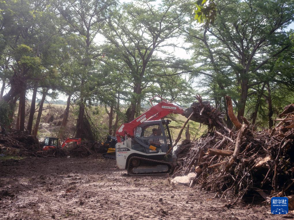 7月8日,挖掘机在美国得克萨斯州瓜达卢普河岸边清理残骸。新华社发(布伦达·巴赞摄)