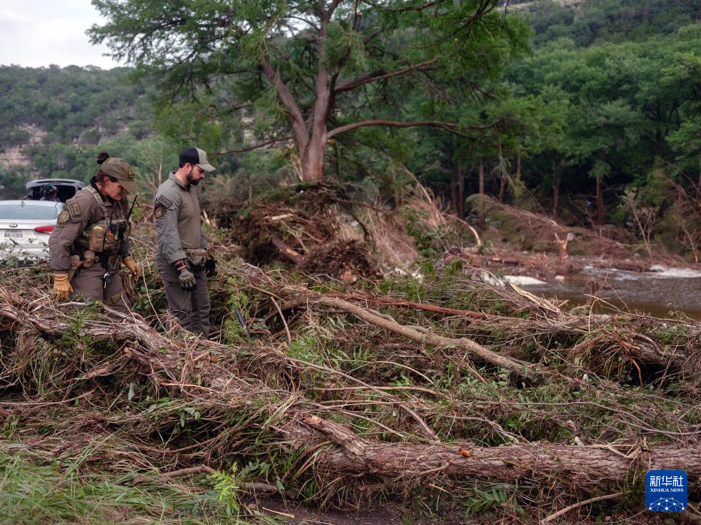 7月5日,一名工作人员在美国得克萨斯州亨特的“神秘营”夏令营周围搜寻。新华社发(布伦达·巴赞摄)