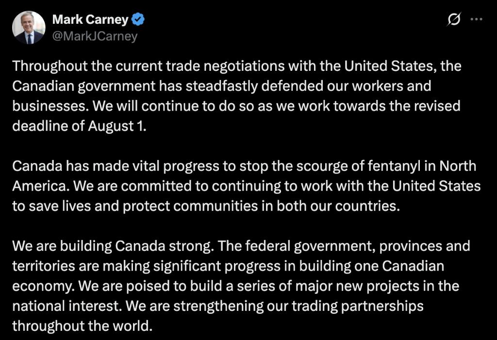 卡尼在社交媒体上说,在当前与美国的贸易谈判中,加拿大政府一直坚定地维护本国工人和企业的利益。“我们将继续这样做,并朝着8月1日这一修订后的最后期限而努力。”