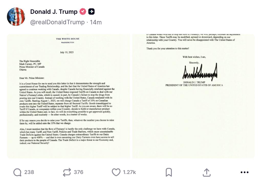 美国总统特朗普10日在社交媒体上发布致加拿大总理卡尼信函截图