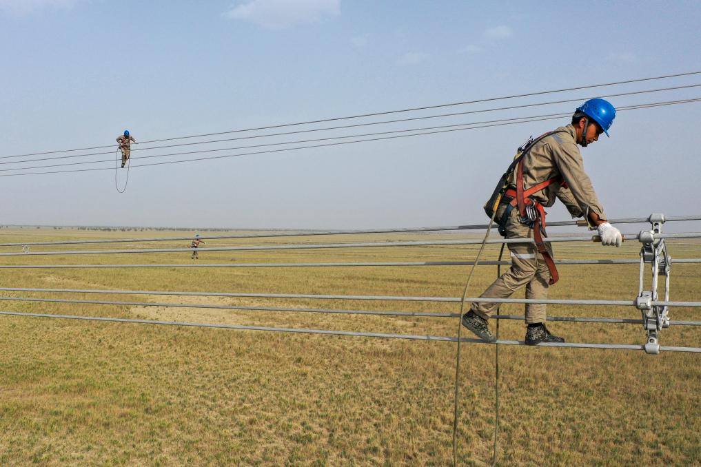 施工人员在且末-若羌750千伏线路开展走线消缺工作(6月24日摄,无人机照片)。 新华社记者 丁磊 摄