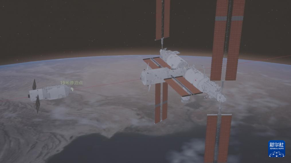 7月15日在北京航天飞行控制中心拍摄的天舟九号货运飞船向空间站组合体靠拢的画面。新华社发(周柯毅 摄)