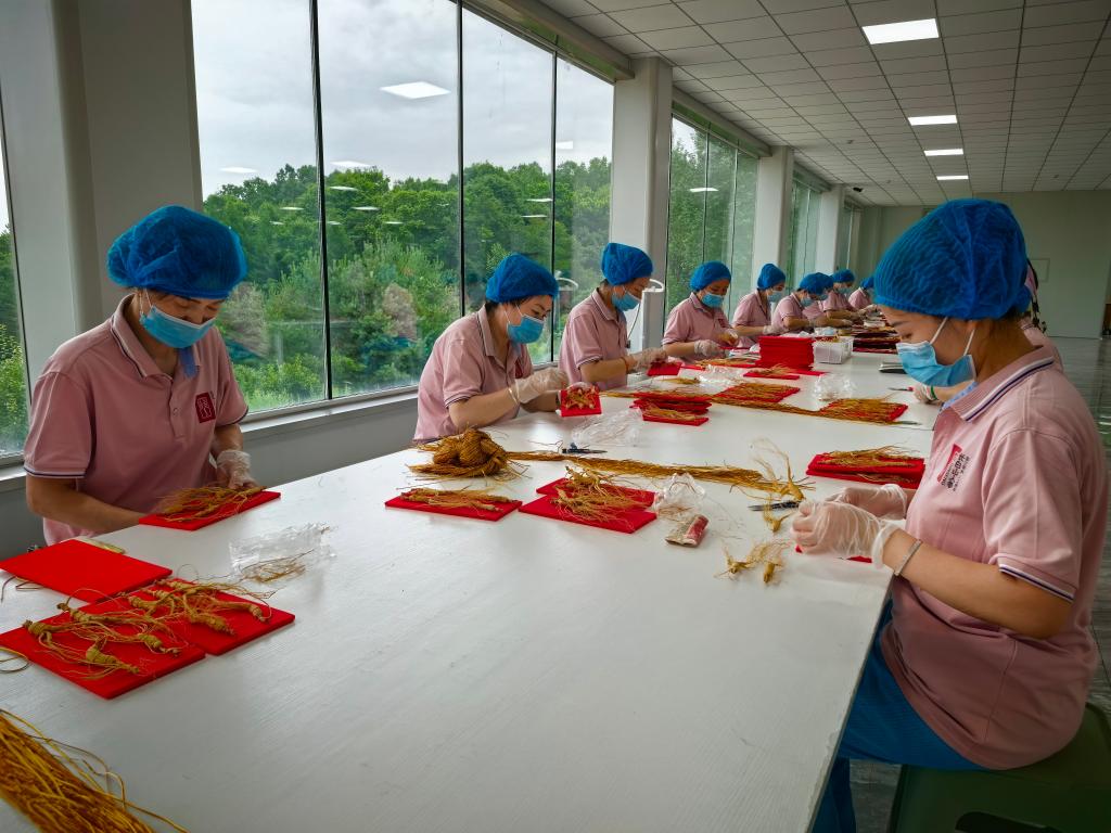 在吉林博大农林生物科技有限公司,工人们对人参进行分拣(7月15日摄)。新华社记者 张博宇 摄