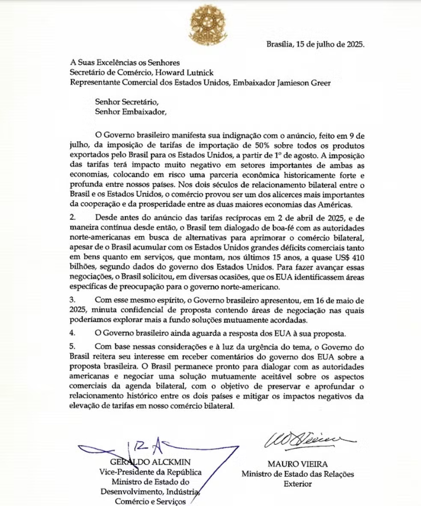 这封信由巴西副总统兼发展、工业、贸易和服务部长阿尔克明以及巴西外交部长维埃拉共同签署。