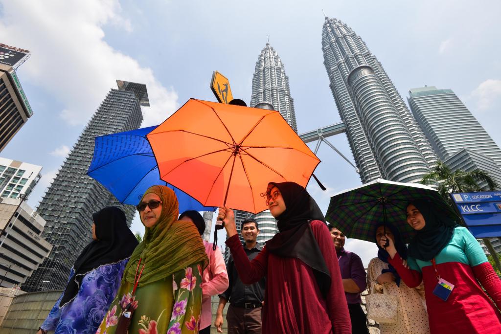 2016年3月,在马来西亚首都吉隆坡,市民在吉隆坡双子塔下撑伞经过。马来西亚气象局表示,因受到厄尔尼诺现象影响,马来西亚正在面临炎热和干旱气候。新华社发(张纹综摄)