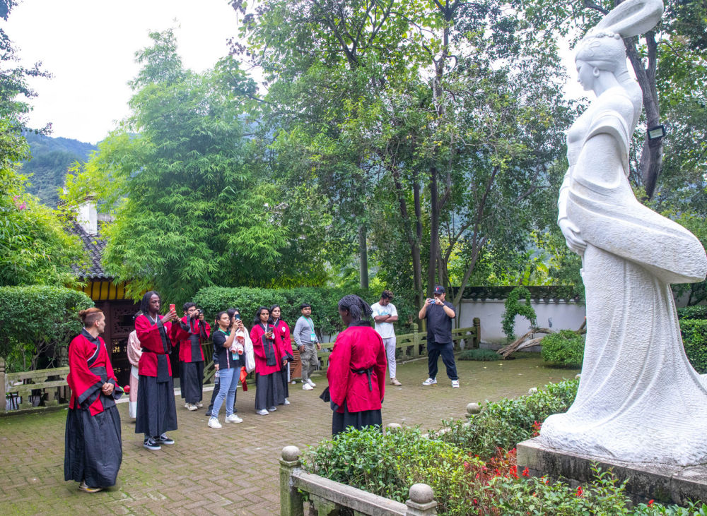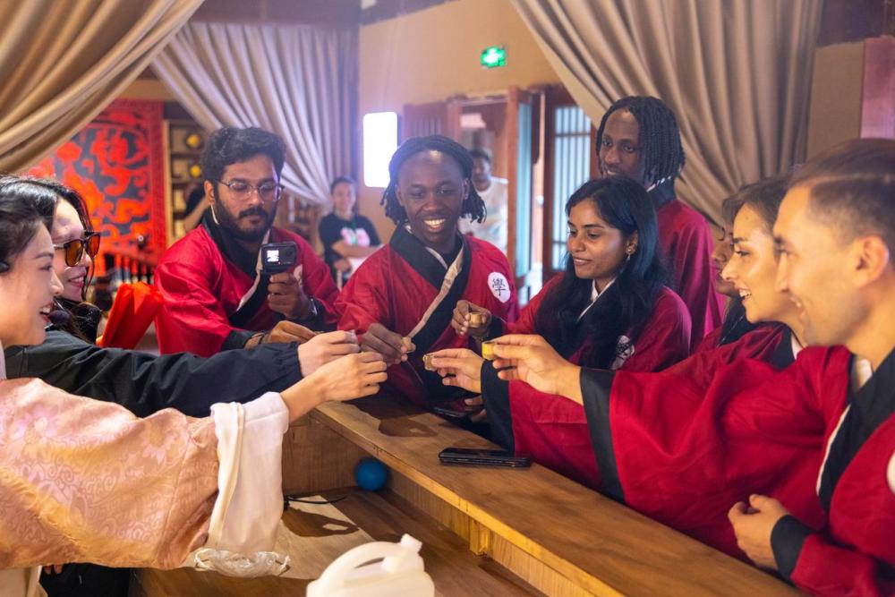 图为国外昭君文化爱好者在昭君村品尝传统土法酿造的美酒。(兴山县委宣传部供图)