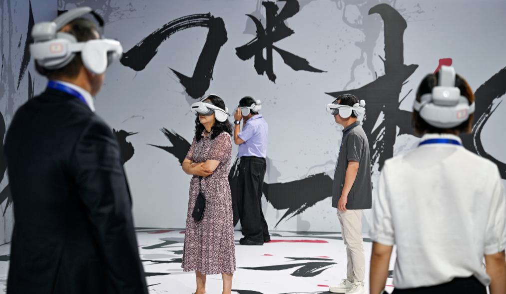 7月4日,2025上海合作组织国家电影节电影市场开幕式及电影科技成果展览启动活动在重庆永川国际会展中心举行,嘉宾观看中国电影科技企业的虚拟影片。新华社记者 陈诚 摄