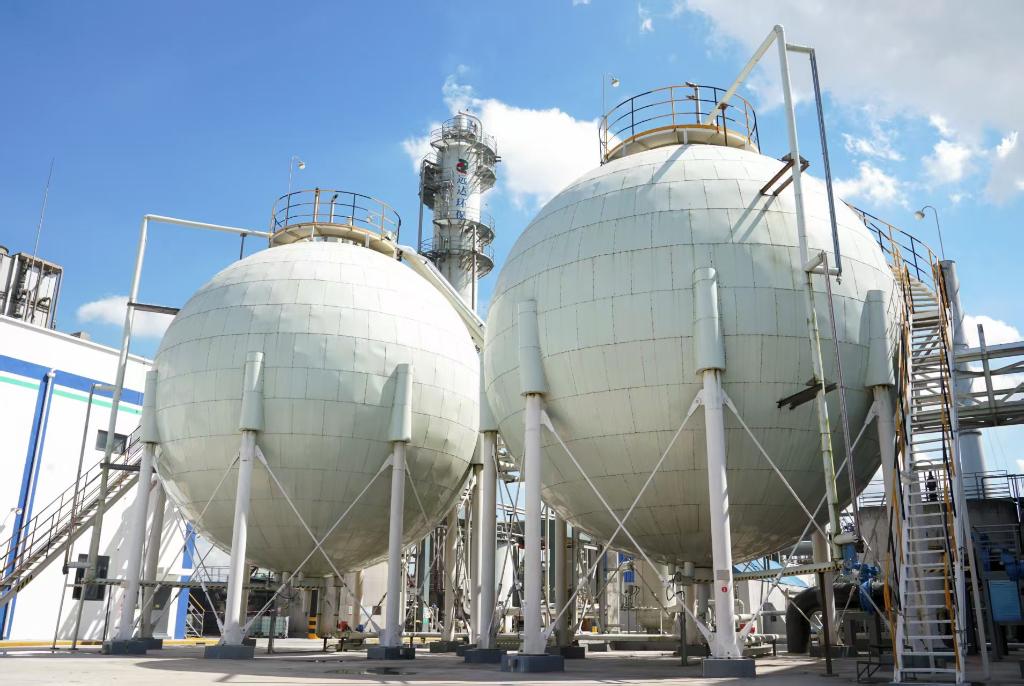 国家电投上海长兴岛热电有限责任公司里的球形碳储设备。 新华社记者 陈浩明 摄
