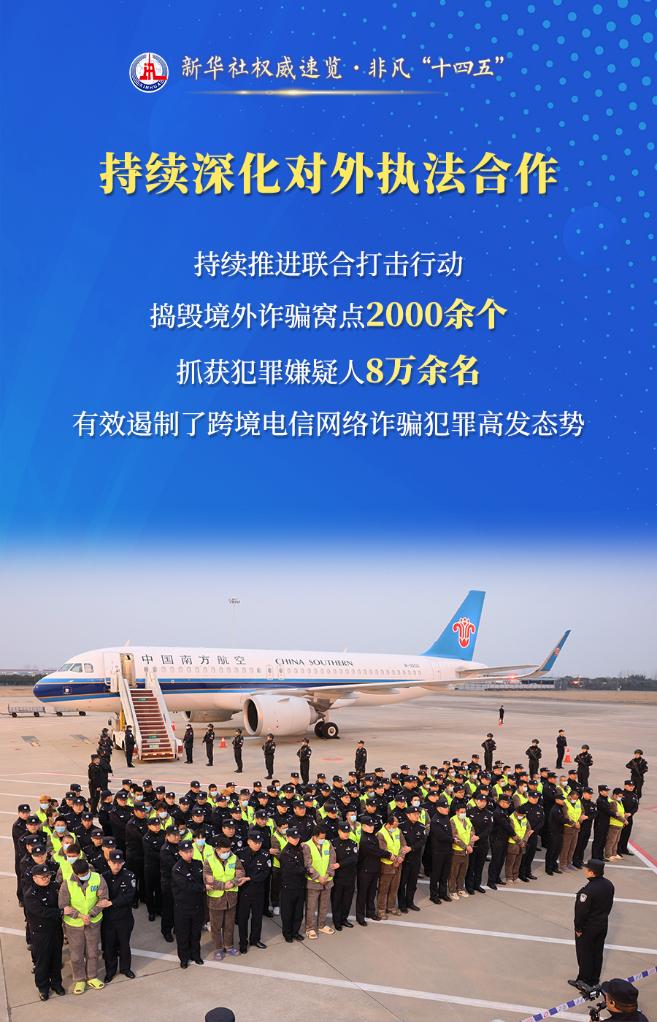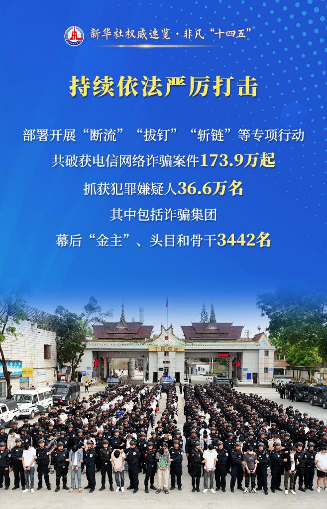 破获电信网络诈骗案件173.9万起、拦截诈骗电话124.1亿次、捣毁境外诈骗窝点2000余个……23日举行的“高质量完成‘十四五’规划”发布会上,公安部用五句话总结了“十四五”期间严打电信网络诈骗犯罪取得的成果。跟随海报,一起看看如何维护人民群众的合法权益。