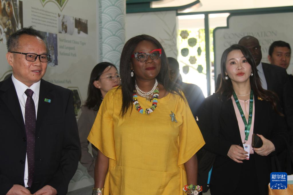 7月23日,在津巴布韦维多利亚瀑布城,《湿地公约》秘书长穆松达·蒙巴(中)参观《湿地公约》第十五届缔约方大会中国馆。新华社发(塔法拉摄)