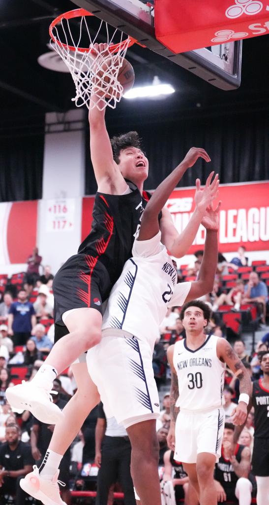 7月15日,在2025年NBA夏季联赛中,波特兰开拓者队93:87战胜新奥尔良鹈鹕队,开拓者队中国球员杨瀚森(左)得到15分。新华社发(孙宇轩摄)