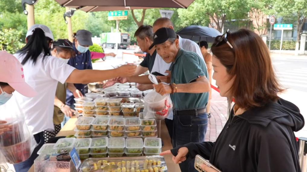 下午三点,在位于浙江湖州市吴兴区龙泉街道祥和社区旁的一家饭店门前,市民朋友们已经排起了长队。店员们将刚出锅的菜品陆续摆上户外的长桌,十几道菜品色香味俱全,路过的市民纷纷加入到选购的队伍中来。