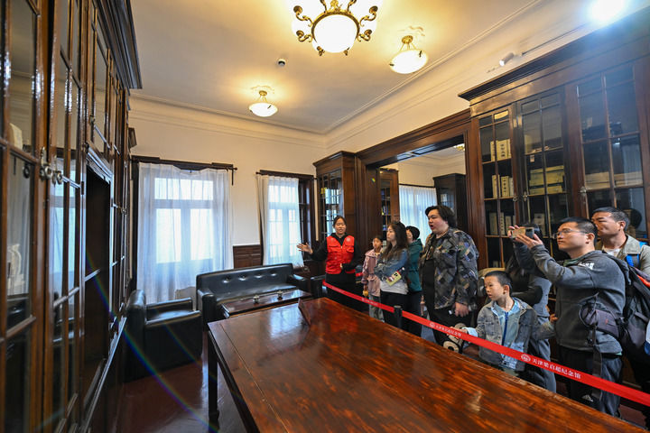 讲解员在天津梁启超纪念馆“饮冰室”书斋内为游客提供免费讲解服务。