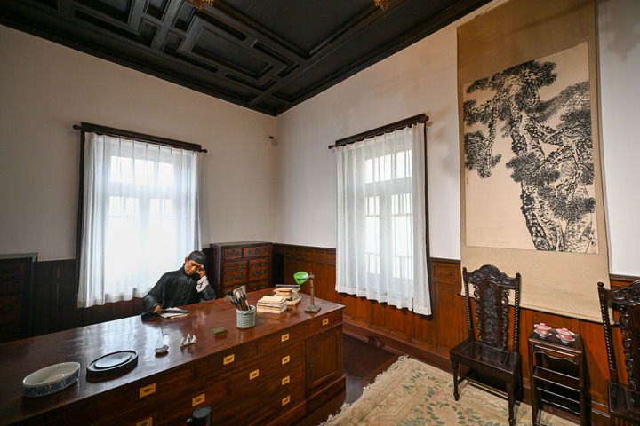 旧居一楼右侧为梁启超的书房。梁启超自1915年举家迁居天津后,此房间便作为书房,直至1924年“饮冰室”书斋落成。在这间书房里,梁启超起草了著名的讨袁檄文——《异哉所谓国体问题者》,并与蔡锷多次密商反袁大计。书房内,立着两尊逼真蜡像,是梁启超和蔡锷一起商讨“护国运动”的情形。