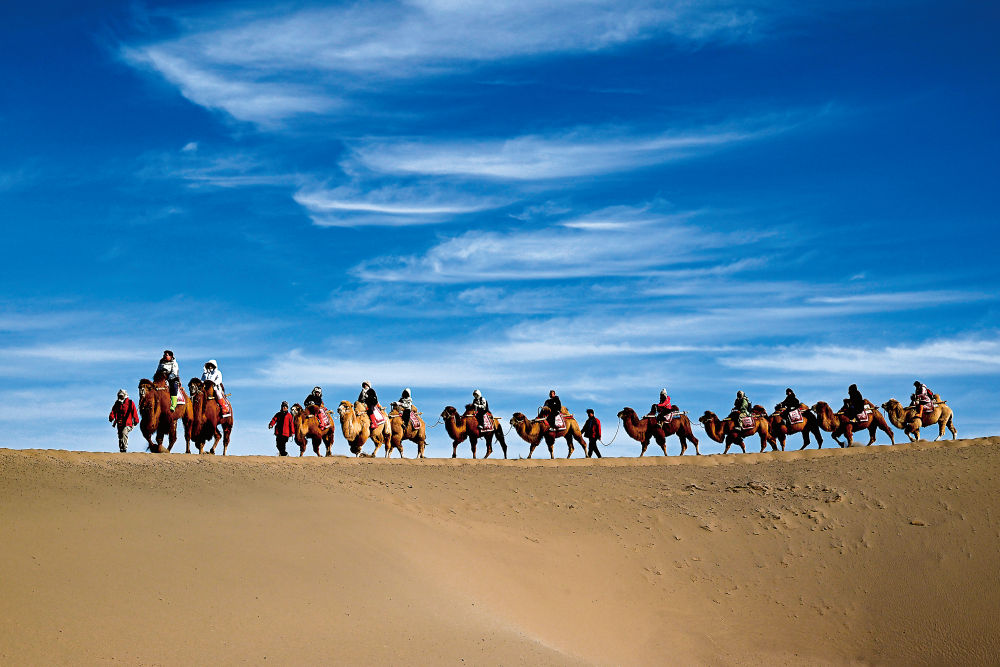 游客在敦煌鸣沙山月牙泉景区骑骆驼游览。张晓亮摄