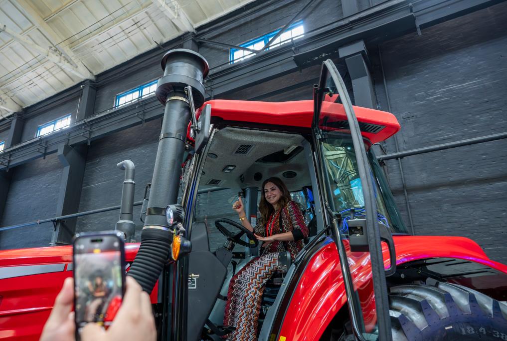 专为大型农场重负荷作业设计、提供更清洁的排放、适配旱田作业需求……步入公司的产品展区,各式拖拉机令代表们目不暇接。当讲解员邀请大家上车体验时,不同功能型号的拖拉机前迅速排起长队。