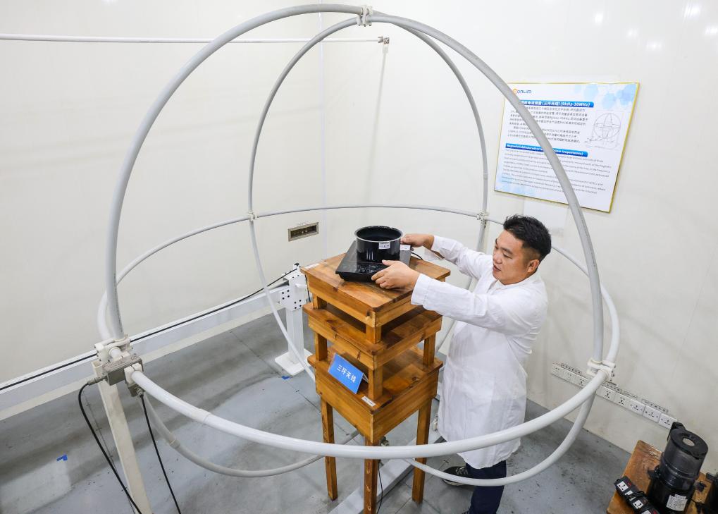 技术人员在新宝股份认证测试中心运用三环天线测量电磁炉磁场感应电流(7月24日摄)。