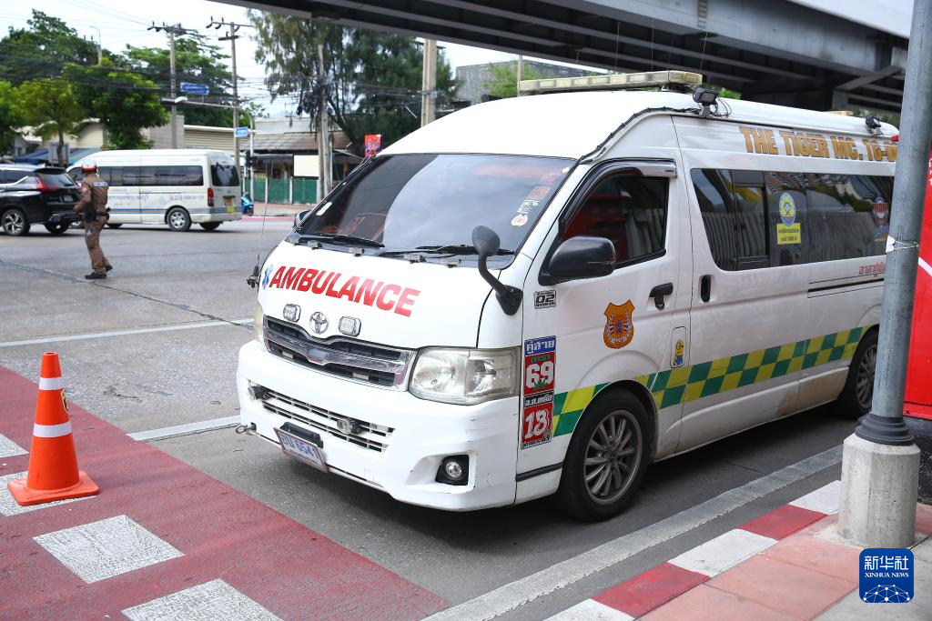 7月28日,在泰国曼谷,救护车停在枪击事件现场附近。新华社记者 孙玮彤 摄