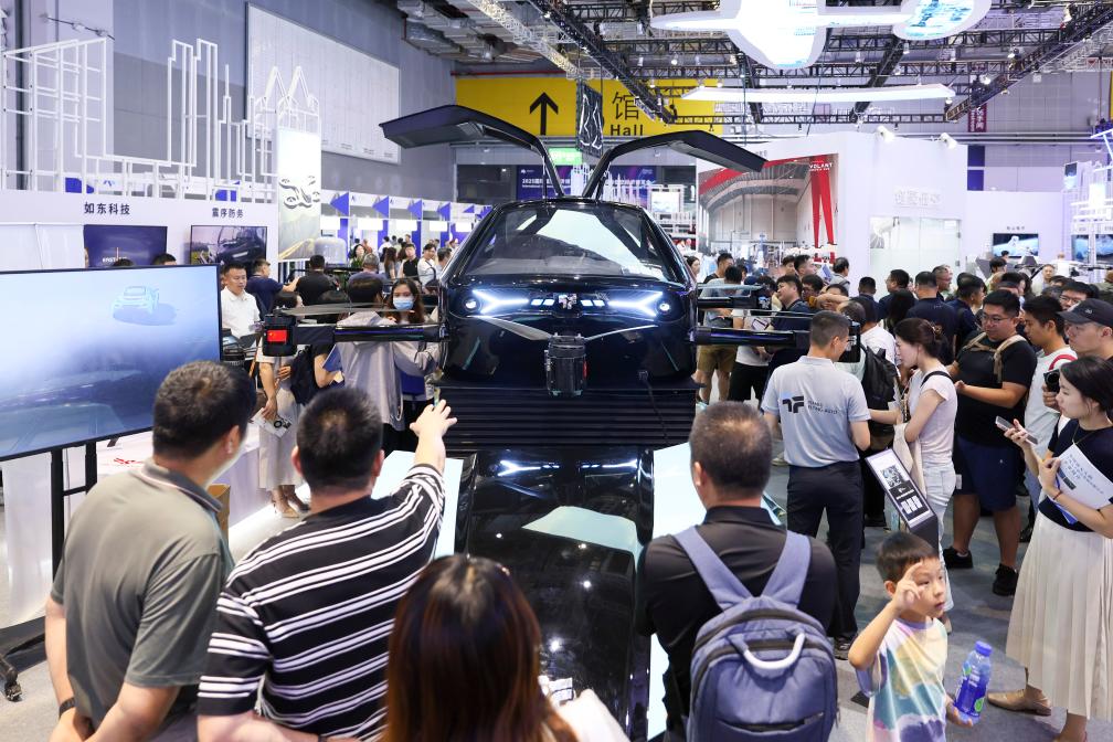 7月23日,观众在博览会现场了解一款飞行汽车。新华社记者王翔 摄