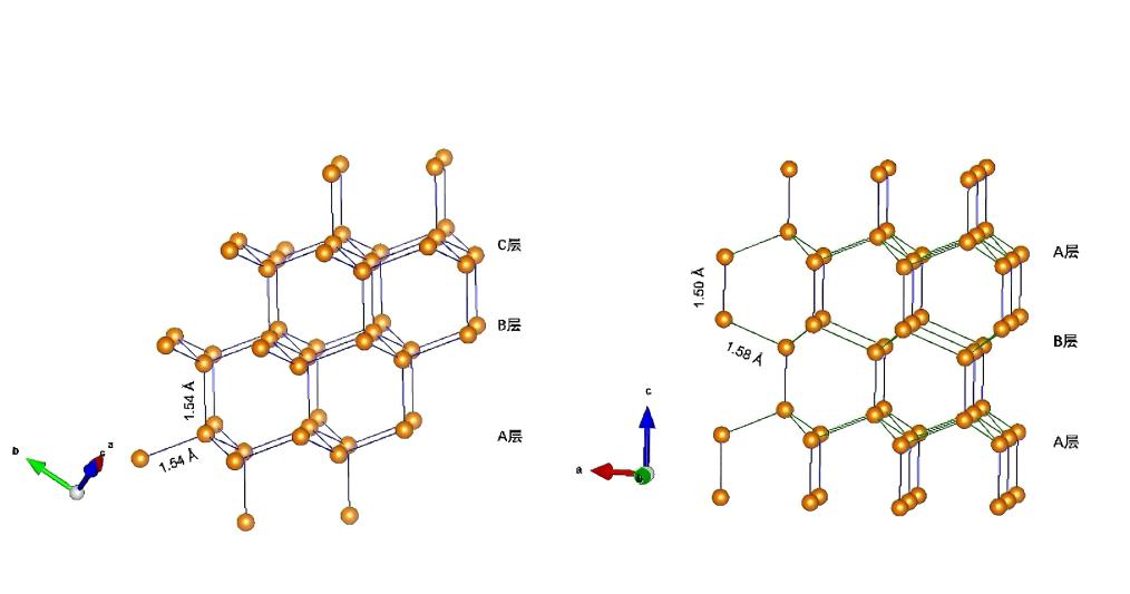 左图为常见金刚石的碳原子结构排列,右图为六方金刚石的碳原子排列。(受访者供图)