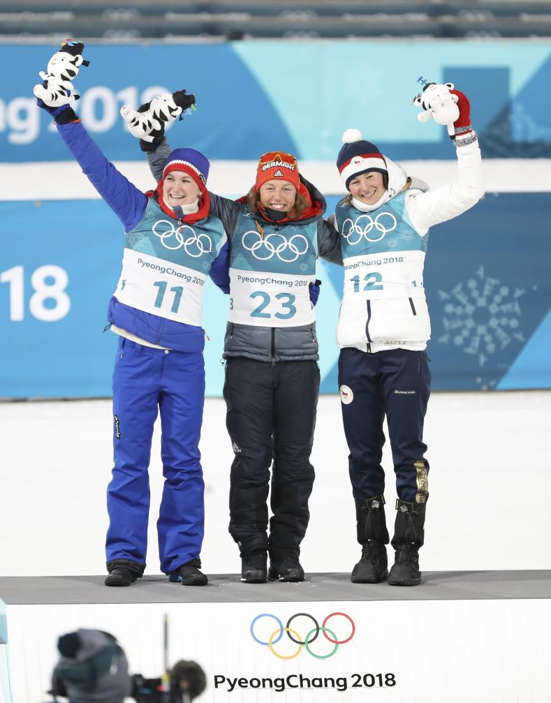 2018年2月10日,达尔迈尔(中)在平昌冬奥会冬季两项女子7.5公里短距离比赛中获得金牌。新华社记者 白雪飞 摄