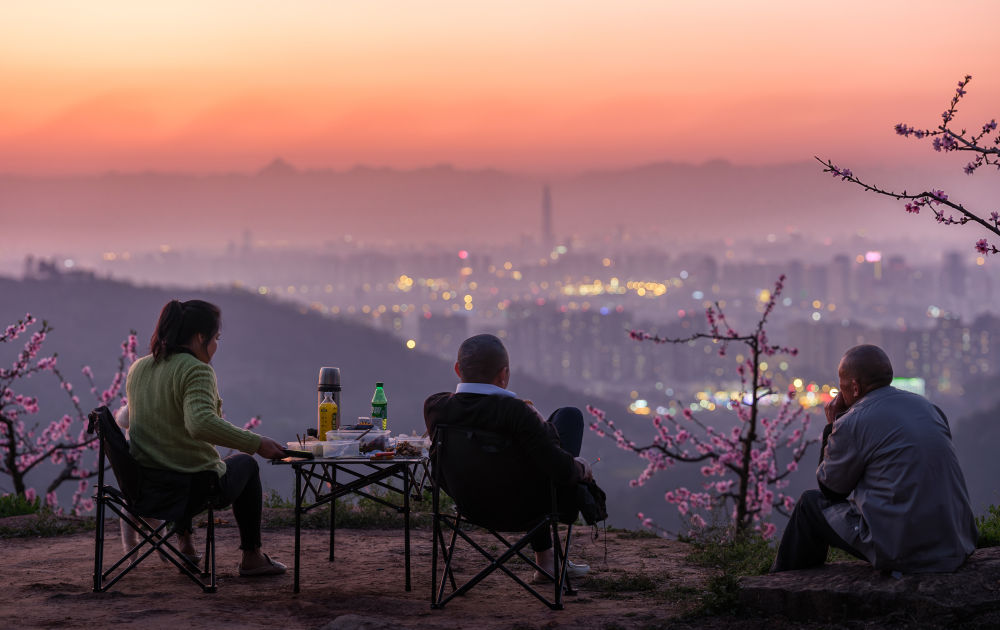 ↑在成都市龙泉山上,几位游客在桃花林下享受落日余晖时刻(2025年3月27日)。新华社发(谢小明摄)
