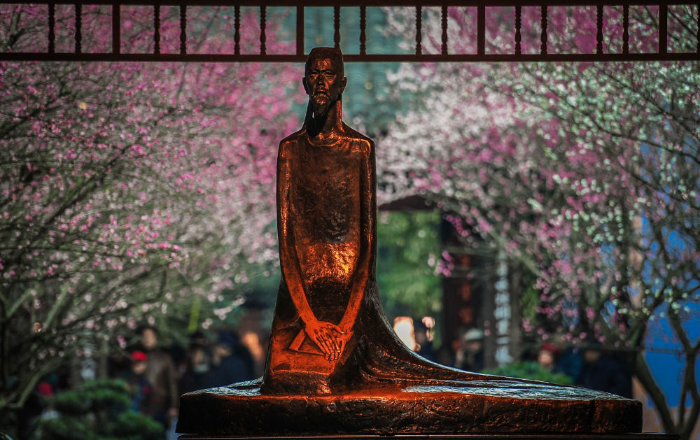 ↑成都杜甫草堂里的杜甫雕像(2023年2月6日摄)。新华社记者 江宏景 摄