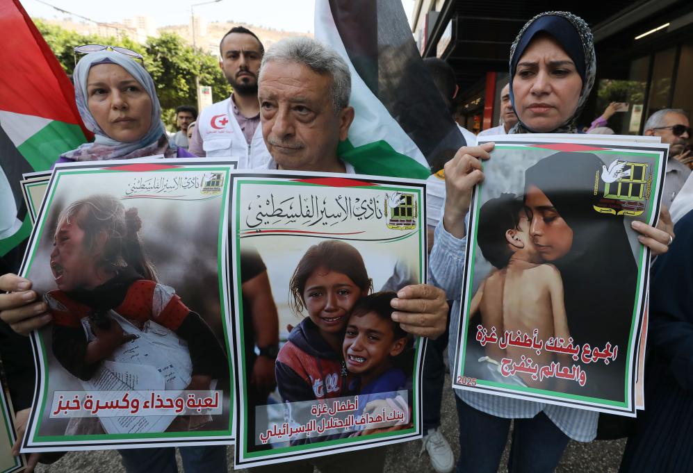 7月29日,人们在约旦河西岸城市纳布卢斯集会,抗议以色列对加沙实施的饥饿政策,呼吁停火止战。新华社发(尼达尔·艾仕塔耶摄)