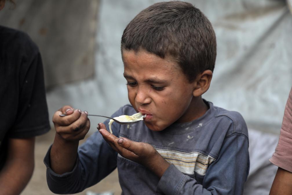 7月29日,在加沙城的一个帐篷里,一名男孩在进食。新华社发(里泽克·阿卜杜勒贾瓦德摄)